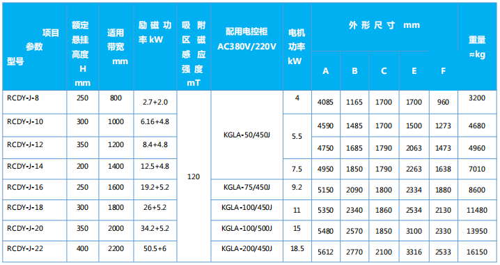 四、RCDY-J系列懸掛式組合回收型除鐵器主要技術參數、外形尺寸     執行標準:JB/T7689、JB/T10885