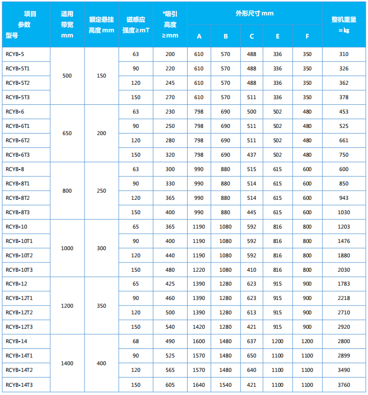 四、RCYB系列懸掛式手動永磁除鐵器主要技術參數、外形尺寸 執(zhí)行標準:JB/T8711